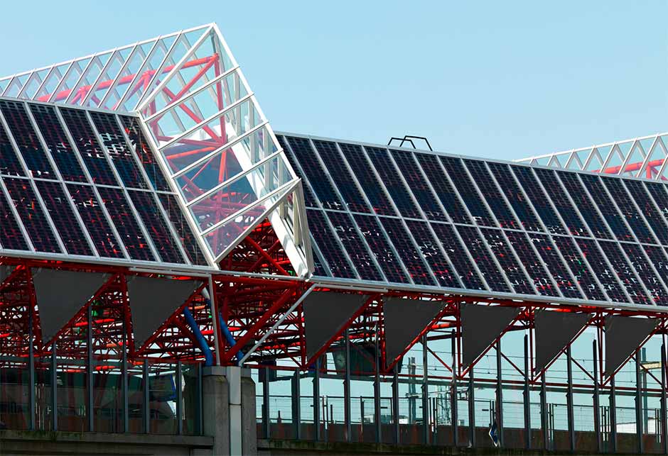 ProRail chose clear glass and polycarbonate dome rooflights to create an aesthetic of transparency. A goal was to make Almere Centrum the greenest railway station in the Netherlands. On project completion, 1,238 roof solar panels will help realize an ambitious green goal. These installations include integrated solar cells in sloping glass panel façades. Solar panels and integrated cells (BIPV Built in Photo Voltaic Cells) span the entirety of the roof. Approximately 387 kWh of energy will be generated in total.