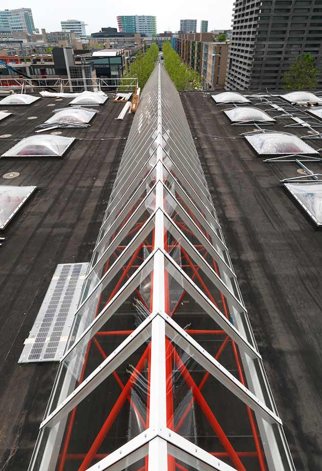 “Buildings adjacent to the station had two additional storeys added,” Rook said, “this meant that the solar panels on the south side of Almere Centrum’s roof would produce 18 percent less energy, due to shadowing. As our rooflight partners, VELUX Commercial worked with us and were on hand to find a solution.”
