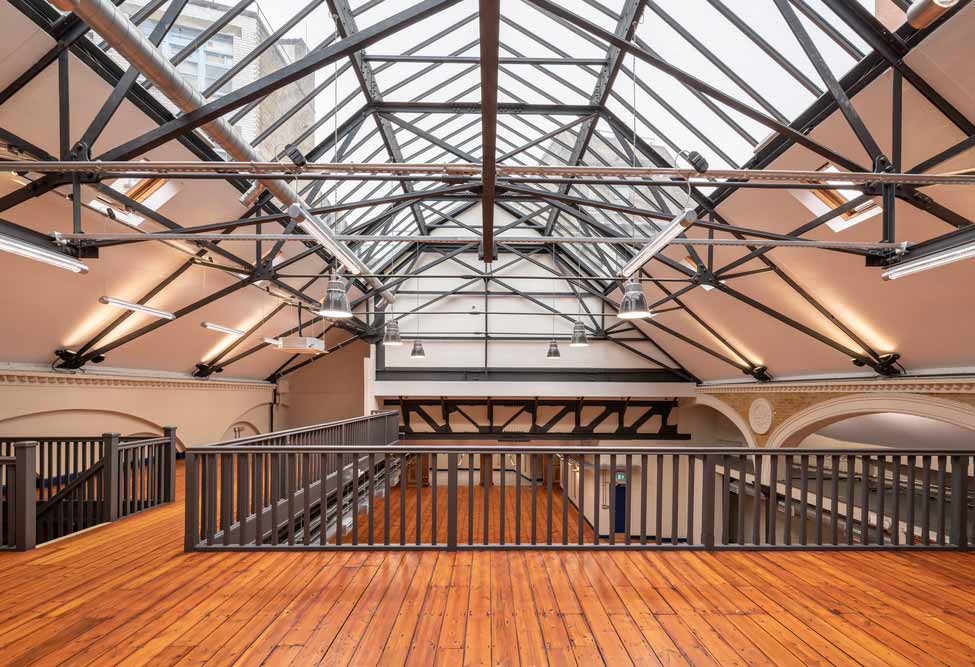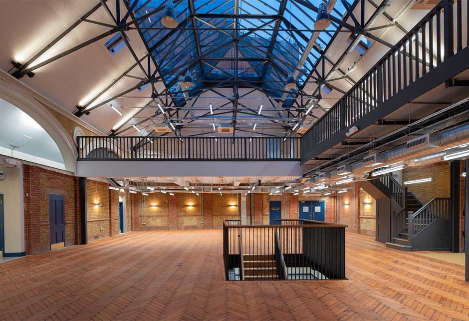 The Drill Hall required the replacement of a leaking roof that once had a two-tier structure of slate and glass. The slate was destroyed by zeppelin bombs and never replaced, but the roof shape and infrastructure remained intact. Expansive refurbishment design plans by E2 Architecture + Interiors included preservation of the roof’s shape to protect the character of the building. Upon inspection by installer Roofglaze, it was agreed that the current single glazing roof system needed to be replaced, and the building retrofit to meet architectural sustainability goals that would answer future building legislation.