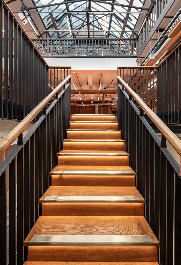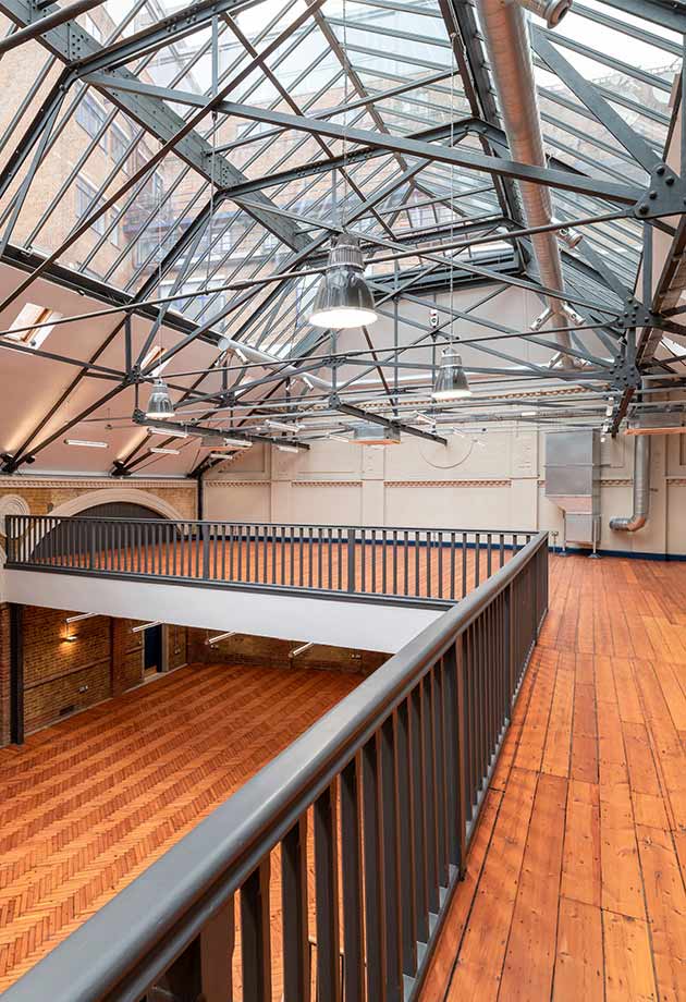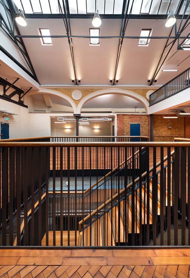 The Drill Hall is hidden down a narrow lane in the London borough of Farringdon. This historic building dates to 1888 and was once a headquarter for the London Rifle Corporation during World War I. Today, The Drill Hall functions as a modern office space transformed by optimised daylight and natural ventilation.