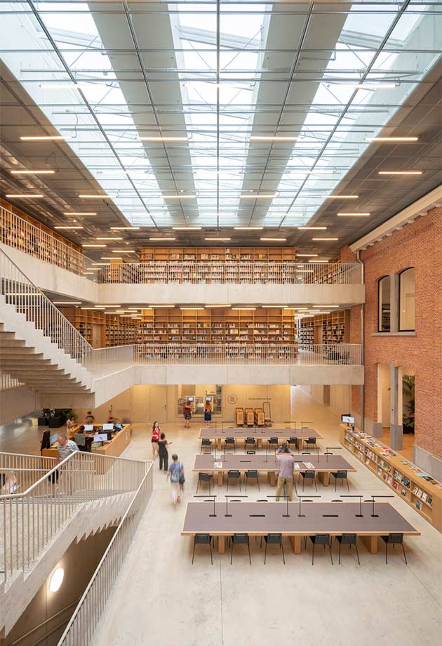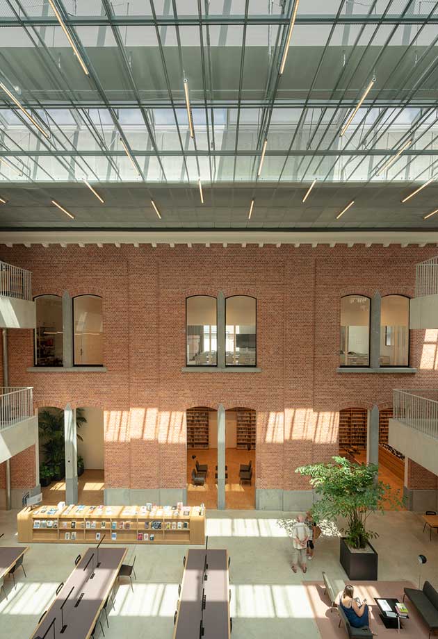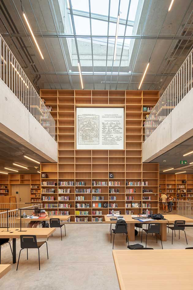 The large amount of natural daylight provides comfort and a nice atmosphere. Sunbeams fall beautifully on the bookshelves and on the inner façade of the old building, which in this way adds luster to the experience of the characteristic historical identity of the place.