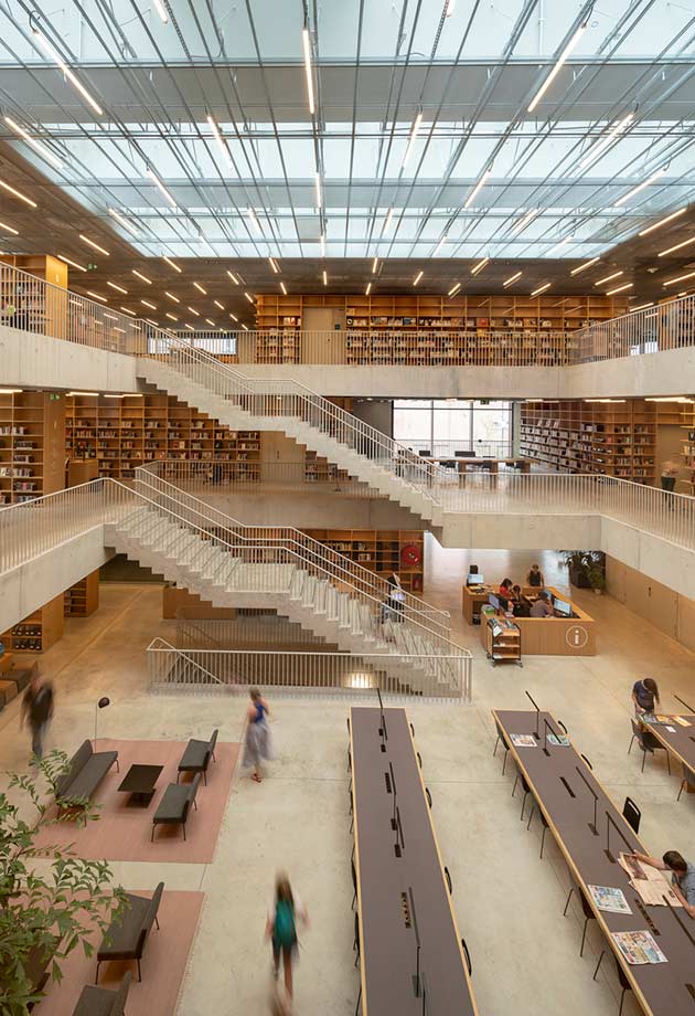 • The library, rehearsal studios, auditoriums and teaching spaces are intimately connected by a patchwork of vast windows, often as high and wide as the rooms themselves.