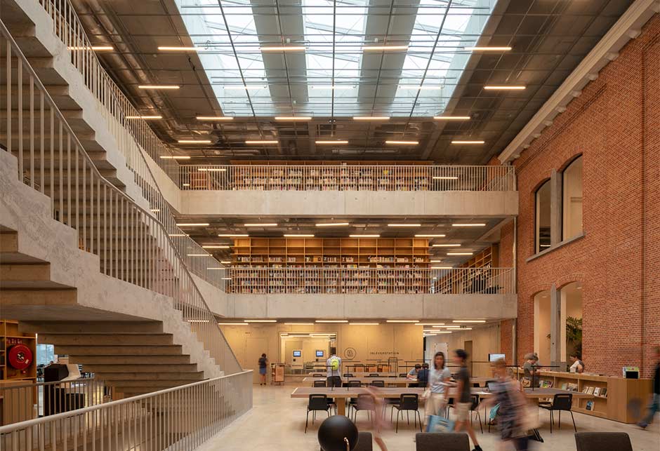 • Outside, the building blends into the urban fabric through its unassuming red brick facade. Inside, it makes a bold architectural statement on the benefits of shared-space learning.